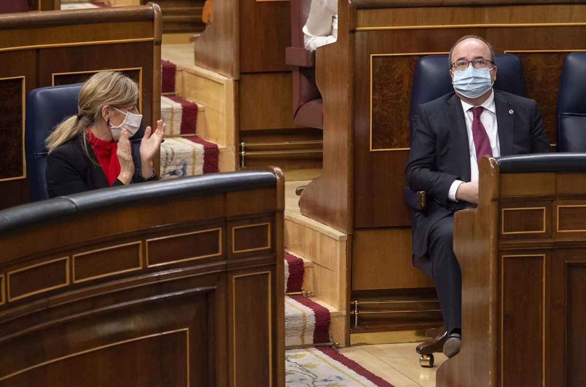 La ministra de Trabajo y Economía Social, Yolanda Díaz, aplaude al lado del ministro de Política Territorial y Función Pública, Miquel Iceta, durante una sesión plenaria en el Congreso de los Diputados, Madrid, (España), a 24 de marzo de 2021. Este plen - EUROPA PRESS/A.Ortega.POOL - Europa Press