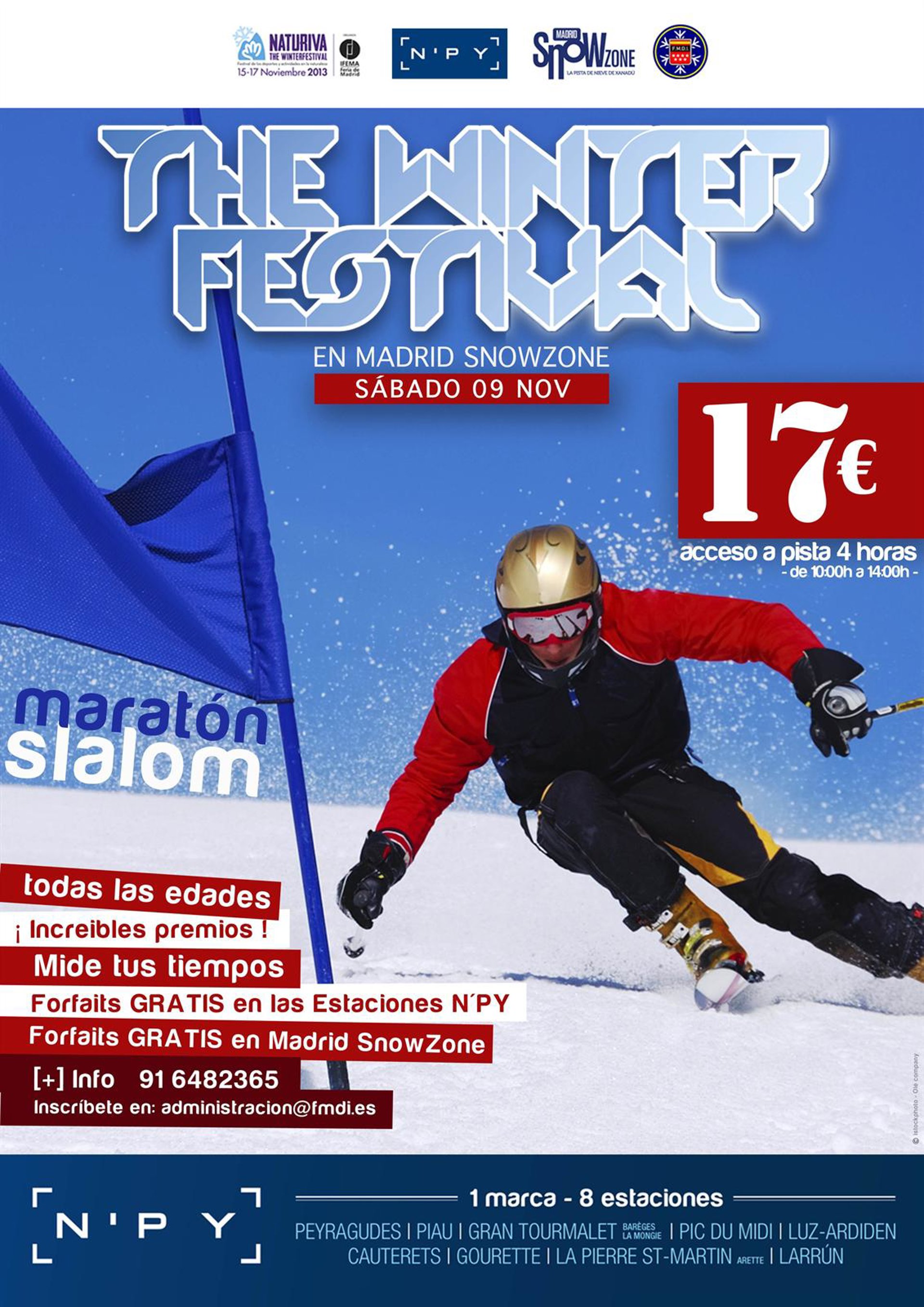 NATURIVA The Winterfestival 2013, Festival de los Deportes y Actividades en la Naturaleza, convocado por Ifema para los días 15, 16 y 17 de noviembre en la Estación 14.1 de la Feria de Madrid, acogerá sendos maratones de Slalom y de Jibbing Free Style que tendrán lugar en la pista de nieve cubierta ubicada en el centro comercial Madrid Xanadú.