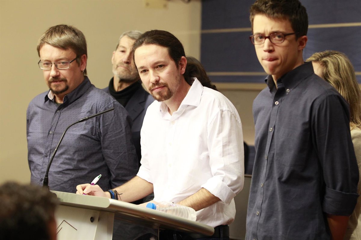 Pablo Iglesias, Xavier Domenech e Iñigo Errejón en rueda de prensa - EUROPA PRESS