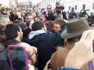 Entre el efusivo ambiente, se ha dirigido al cofundador y exdirigente de Podemos, Juan Carlos Monedero, y, con lágrimas en los ojos, ambos se han abrazado.
