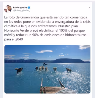 En un mensaje en su perfil de Twitter, Iglesias comparte la fotografía en la que queda patente el deshielo bajo las pisadas de unos perros que tiran de un trineo. El líder de Podemos señala que, ante esta crisis, su formación propone su plan 'Horizonte Verde' que prevé "electrificar el cien por cien del parque móvil español" y "reducir en un 90 por ciento las emisiones de hidrocarburos para el 2040".
