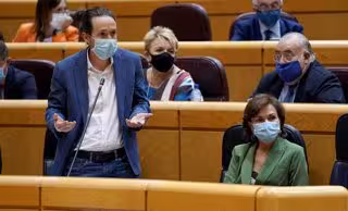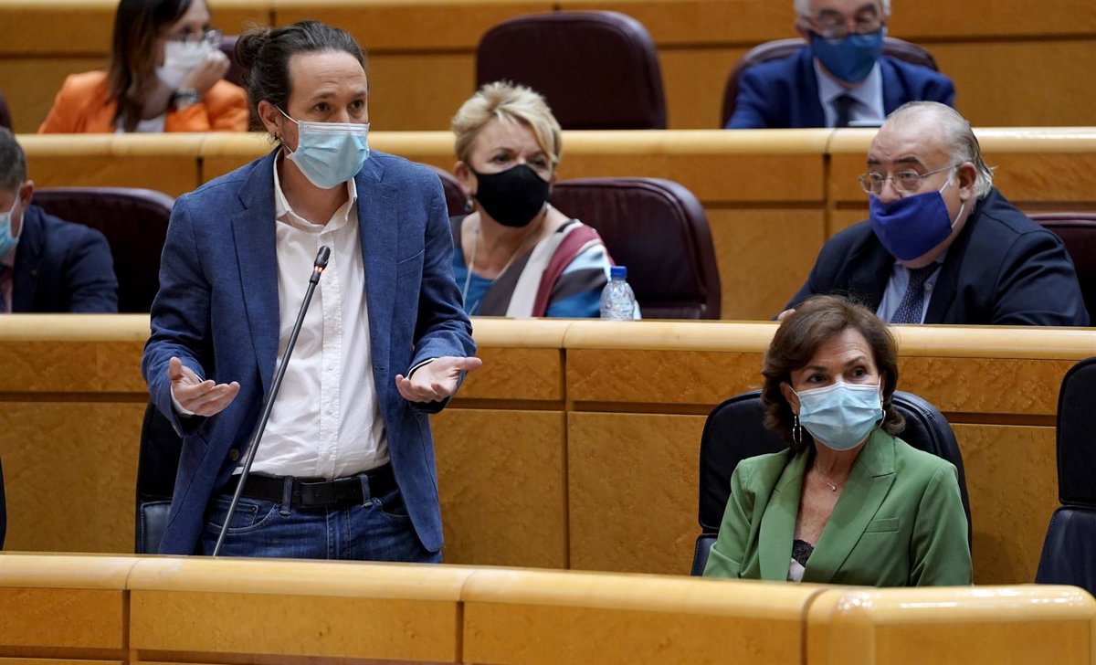 El vicepresidente segundo del Gobierno, Pablo Iglesias, interviene junto a la vicepresidenta primera, Carmen Calvo, durante una sesión de control al Gobierno en el Senado, en Madrid (España), a 22 de septiembre de 2020. - Pool