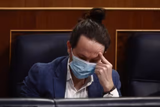 El vicepresidente segundo del Gobierno, Pablo Iglesias, se toca la cabeza durante una sesión de control al Gobierno en el Congreso de los Diputados, en Madrid (España), a 10 de marzo de 2021. - EUROPA PRESS/E. Parra. POOL - Europa Press