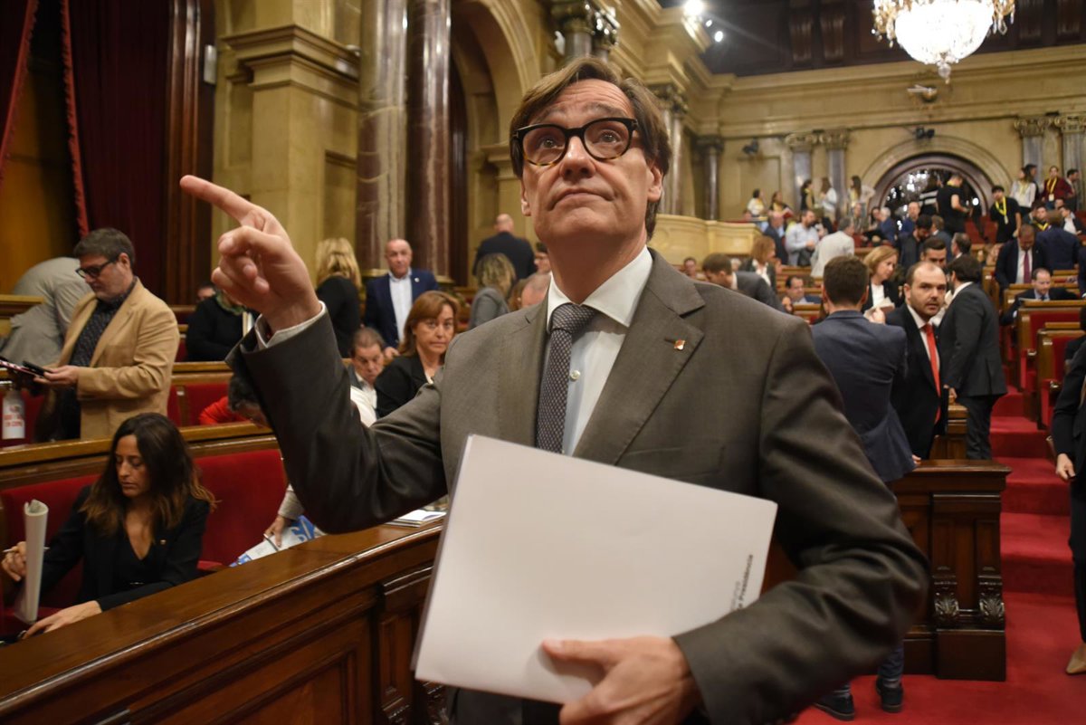 El presidente de la Generalitat, Salvador Illa, abandona el pleno del Parlament tras conocerse el balance provisional de 51 víctimas en la provincia de Valencia por la DANA. - ALBERTO PAREDES-EUROPA PRESS
