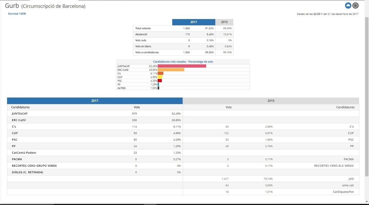 Las fuerzas independentistas se han impuesto este domingo en Gurb, la localidad barcelonesa donde tiene su sede la empresa Casa Tarradellas y donde, con todos los votos escrutados, Junts per Catalunya, ERC y la CUP han logrado más del 86% de los sufragios.