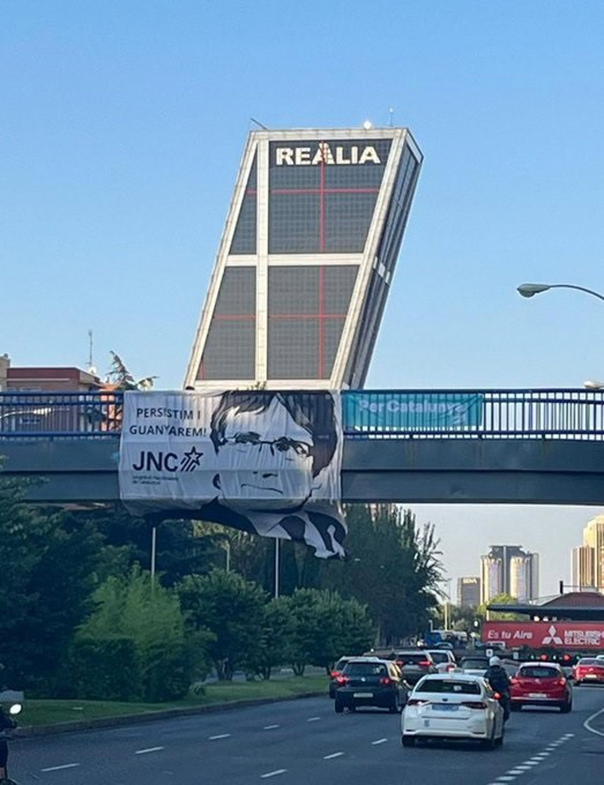 "¡Persistimos y ganaremos!", es el mensaje en catalán que figura en la pancarta, junto con un retrato de Puigdemont, y la JNC lo ha difundido en redes sociales cosechando numerosos apoyos de políticos independentistas de Junts.