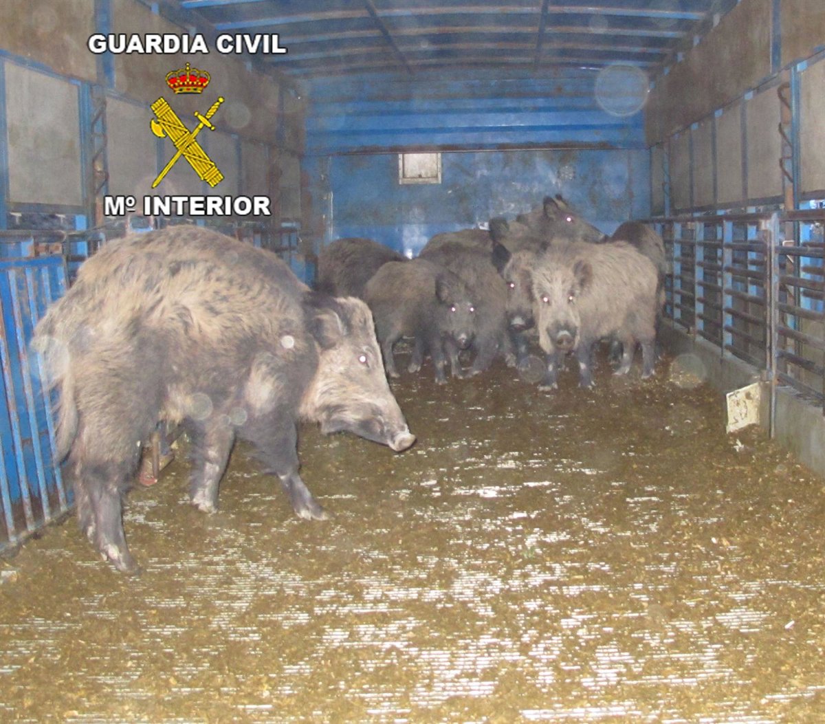 Al inspeccionar la carga los agentes del Seprona descubrieron que eran jabalíes, tanto machos, como hembras y jabatos, y que estos animales eran transportados amontonados, golpeándose unos contra otros y contra las paredes de la caja del camión, ya que no viajaban en compartimentos individuales, como sería preceptivo para los transportes legales de animales.