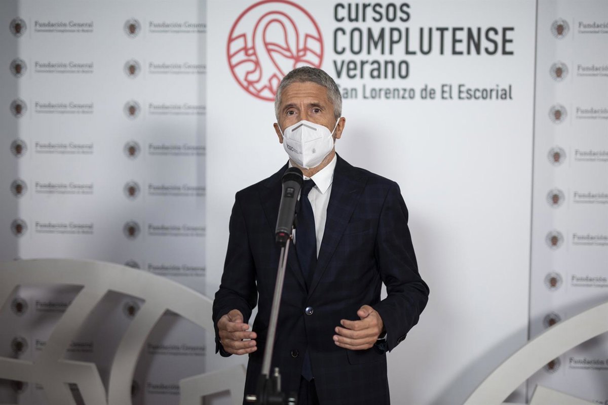 El ministro del Interior, Fernando Grande-Marlaska, imparte su ponencia 'Pensando en la seguridad pública en la próxima década', en el curso 'Retos y política de seguridad en España: Construyendo el modelo de la seguridad 2030'. - Alejandro Martínez Vélez - Europa Press