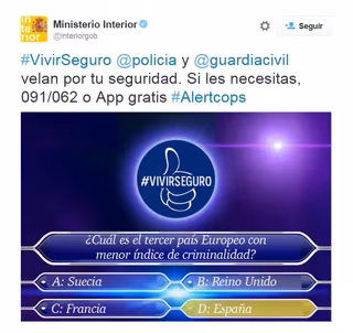 El primero de los tuits, publicado desde la cuenta oficial del ministerio en Twitter, además de recordar los números de teléfono de la Policía y la Guardia Civil (091 y 062, respectivamente) adjunta una imagen emulando el formato del concurso de televisión 'Quién quiere ser millonario' con la pregunta: "¿Cuál es el tercer país Europeo con menor índice de criminalidad?".