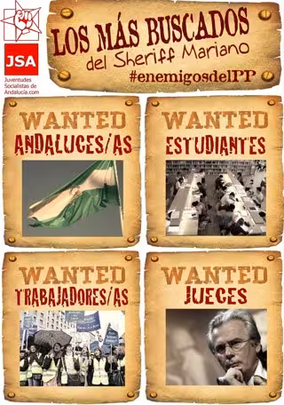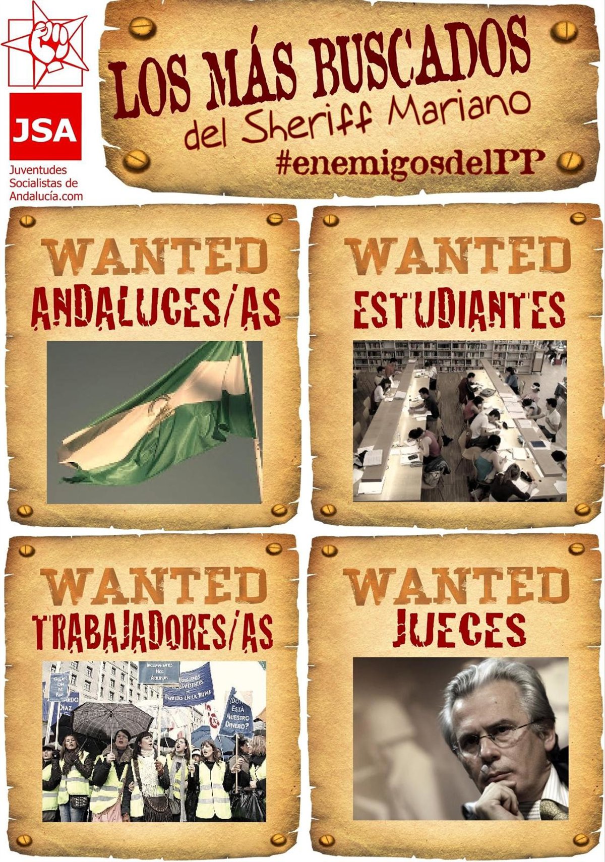 Juventudes Socialistas de Andalucía (JSA) ha presentado este lunes en Córdoba su campaña para el 28F 'Los más buscados por el sheriff Mariano', en la que, en palabras de su secretario general, Juan Carlos Ruiz, critican "las tropelías del presidente del Gobierno, Mariano Rajoy, contra sus enemigos andaluces, como la enseñanza pública, los opositores a profesor, los trabajadores y algunos jueces, a los que él mismo ha puesto en su punto de mira".