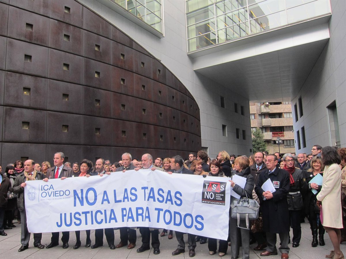 Jueces, fiscales y abogados del Principado de Asturias se han manifestado este miércoles delante de los juzgados de Oviedo para mostrar su rechazo a las medidas adoptadas por el Ministerio de Justicia, entre ellas la ley de tasas que hace "peligrar la justicia para buena parte de la ciudadanía".