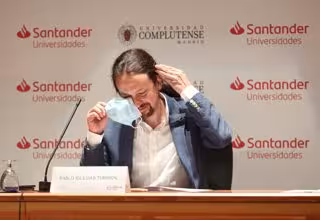 El vicepresidente segundo del Gobierno, ministro de Derechos Sociales y Agenda 2030, Pablo Iglesias, se quita la mascarilla antes de intervenir en la ponencia ‘La centralidad del objetivo no 10: reducción de las desigualdades’. - Eduardo Parra - Europa Press
