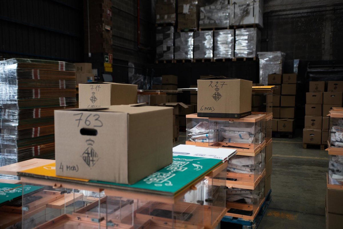 Urnas y equipos de protección individual que se repartirán en los colegios electorales de Barcelona para los comicios del 14 de febrero. - MARC BRUGAT - EUROPA PRESS