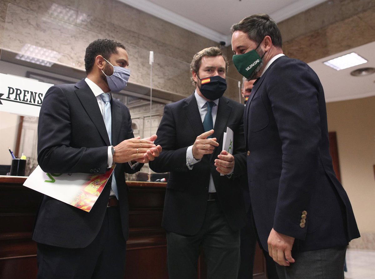 (I-D) El diputado de Vox, Ignacio Garriga, el portavoz de Vox en el Congreso de los Diputados, Iván Espinosa de los Monteros, el diputado y secretario general de Vox, Javier Ortega Smith y el presidente de VOX, Santiago Abascal - EUROPA PRESS/E. Parra. POOL - Europa Press