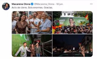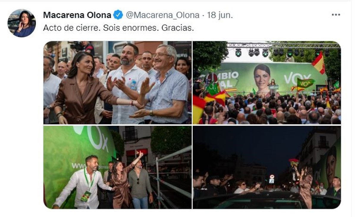 En el caso de Macarena Olona, la JEA considera "indudable" que las imágenes del mensaje difundido a través de la cuenta personal de Twitter de la candidata a la Presidencia de la Junta en la jornada de reflexión "constituyen actos de propaganda electoral a los efectos del artículo 53 de la Loreg, en cuanto que presentan una evidente connotación electoralista, al reproducir diversos momentos del acto de cierre de campaña electoral de la formación política en forma tal que se aprecia claramente que se está induciendo, directa o indirectamente, al voto de los electores, máxime cuando esas imágenes van acompañadas del texto 'Sois enormes. Gracias'.