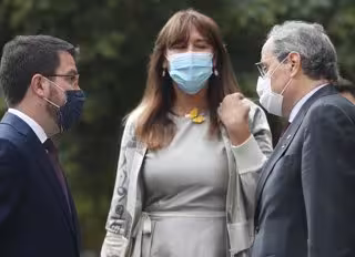 (I-D) El vicepresdiente de la Generalitat, Pere Aragons; la portavoz de Junts per Catalunya en el Congreso de los Diputados, Laura Borrs; y el presidente de la Generalitat, Quim Torra, a la llegada de este último al Tribunal Supremo (TS), en Madrid - Eduardo Parra - Europa Press
