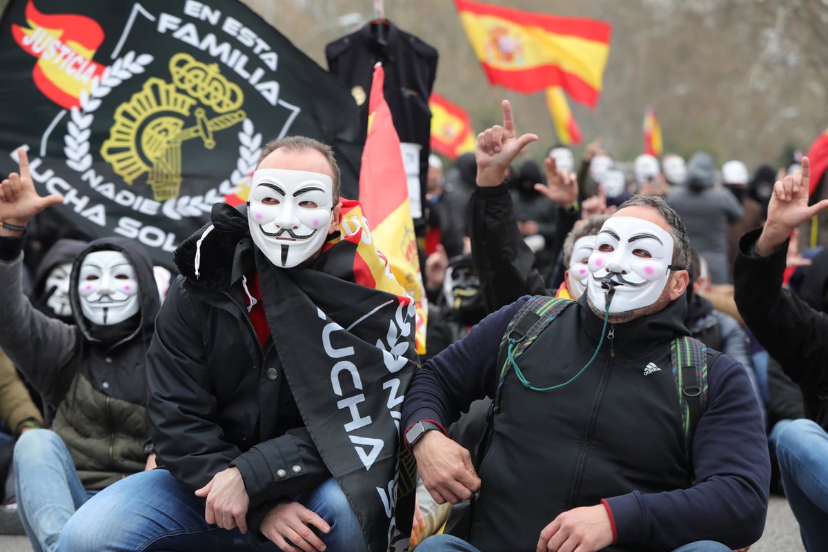Varios manifestantes con máscaras de Anonymous y banderas de España se concentran en la Plaza de Neptuno en rechazo a la no autorización por el Gobierno a la tramitación parlamentaria de la Iniciativa Legislativa Popular (ILP) presentada por Jusapol. - Jesús Hellín - Europa Press