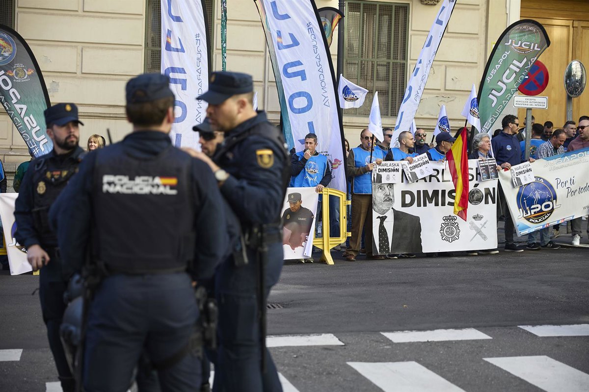 Más de medio centenar de manifestantes han secundado este lunes la concentración convocada por el sindicato Jupol frente al Ministerio del Interior para exigir la dimisión del titular de esta cartera, Fernando Grande-Marlaska, y del director general de la Policía, Francisco Pardo Piqueras, tras la querella por agresión sexual de una agente contra el director adjunto operativo (DAO) José Ángel González.
