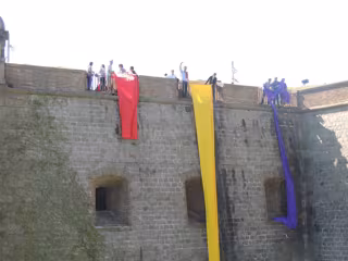 La Joventut Socialista de Catalunya (JSC), las juventudes del PSC, han colgado este domingo una bandera republicana en el Castillo de Montjuïc de Barcelona en conmemoración del aniversario de la Segunda Republica.