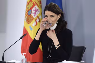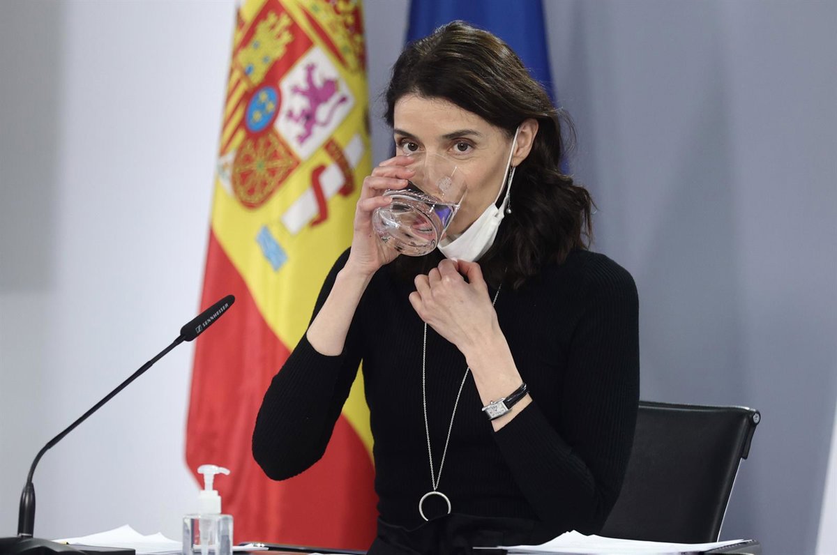 La ministra de Justicia, Pilar Llop, se toma un vaso de agua antes de comparecer tras el Consejo de Ministros en Moncloa, a 12 de abril de 2022, en Madrid (España). El Gobierno ha aprobado la Ley 20/2021, denominada como Ley de interinos, para reducir - Eduardo Parra - Europa Press