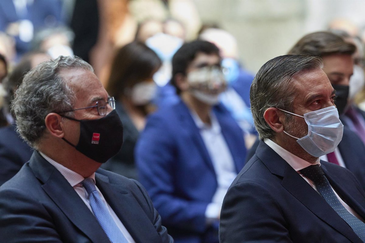 El consejero de Educación, Universidades, Ciencia y portavoz del Gobierno, Enrique Ossorio (i) y el consejero de Presidencia, Justicia e Interior, Enrique López, en el acto de toma de posesión del Consejo de Gobierno de la Comunidad de Madrid. - Jesús Hellín - Europa Press