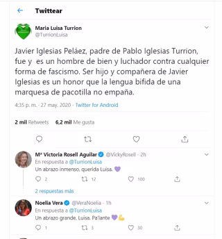 A través de un mensaje en su cuenta de Twitter, recogido por Europa Press, Turrión subraya que el padre del también líder de Podemos "fue y es un hombre de bien y luchador contra cualquier forma de fascismo".