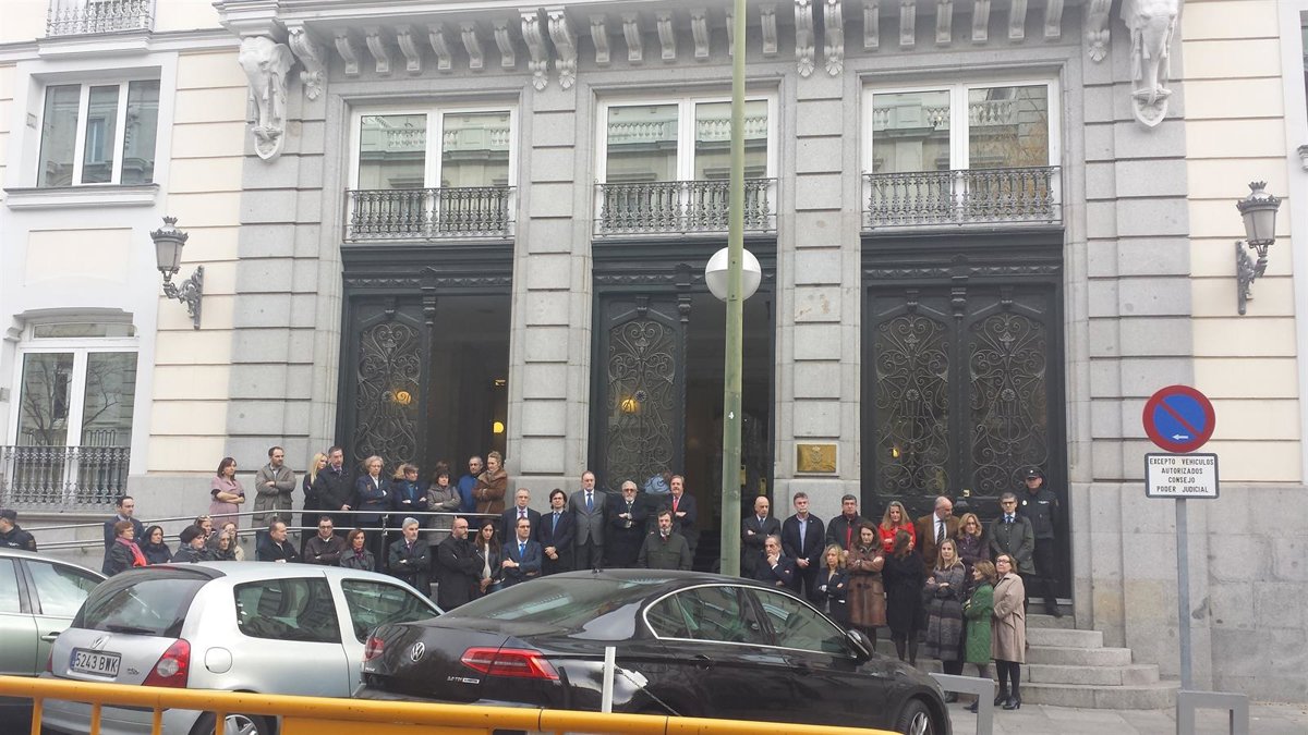 Magistrados y jueces de la Audiencia Nacional y del Tribunal Supremo y vocales del Consejo General del Poder Judicial (CGPJ), además de numerosos trabajadores en estos organismos han salido hoy a las puertas de sus respectivos edificios a las 12.00 hora para guardar un minuto de silencio en homenaje a los policías Isidro Gabino Sanmartín y Jorge García Tudela, asesinados el pasado viernes durante un ataque talibán a la Embajada de España en Kabul.