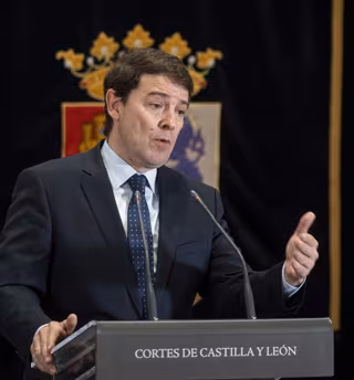 El presidente de Castilla y León, Alfonso Fernández Mañueco, interviene tras tomar posesión de su cargo de como presidente de la Junta de Castilla y León, en la sede de las Cortes de Castilla y León, a 19 de abril de 2022. - Photogenic/Claudia Alba - Europa Press