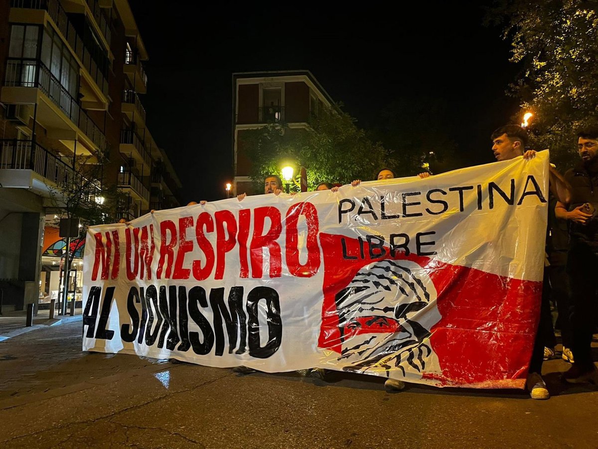 Asimismo, los manifestantes se han parado en la plaza de Nelson Mandela para desenvolver una pancarta con el escrito "Contra el sionismo, Palestina vencerá" y seguir con sus cánticos como "Ayuso sionista, estás en nuestra lista" o "Madrid será la tumba del sionismo".