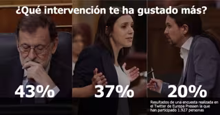 Un 43% de los lectores que ha participado en nuestra encuesta de Twitter afirma que ha sido la intervención del presidente del Gobierno Mariano Rajoy la que más le ha gustado durante el debate de la moción de censura celebrado este martes.