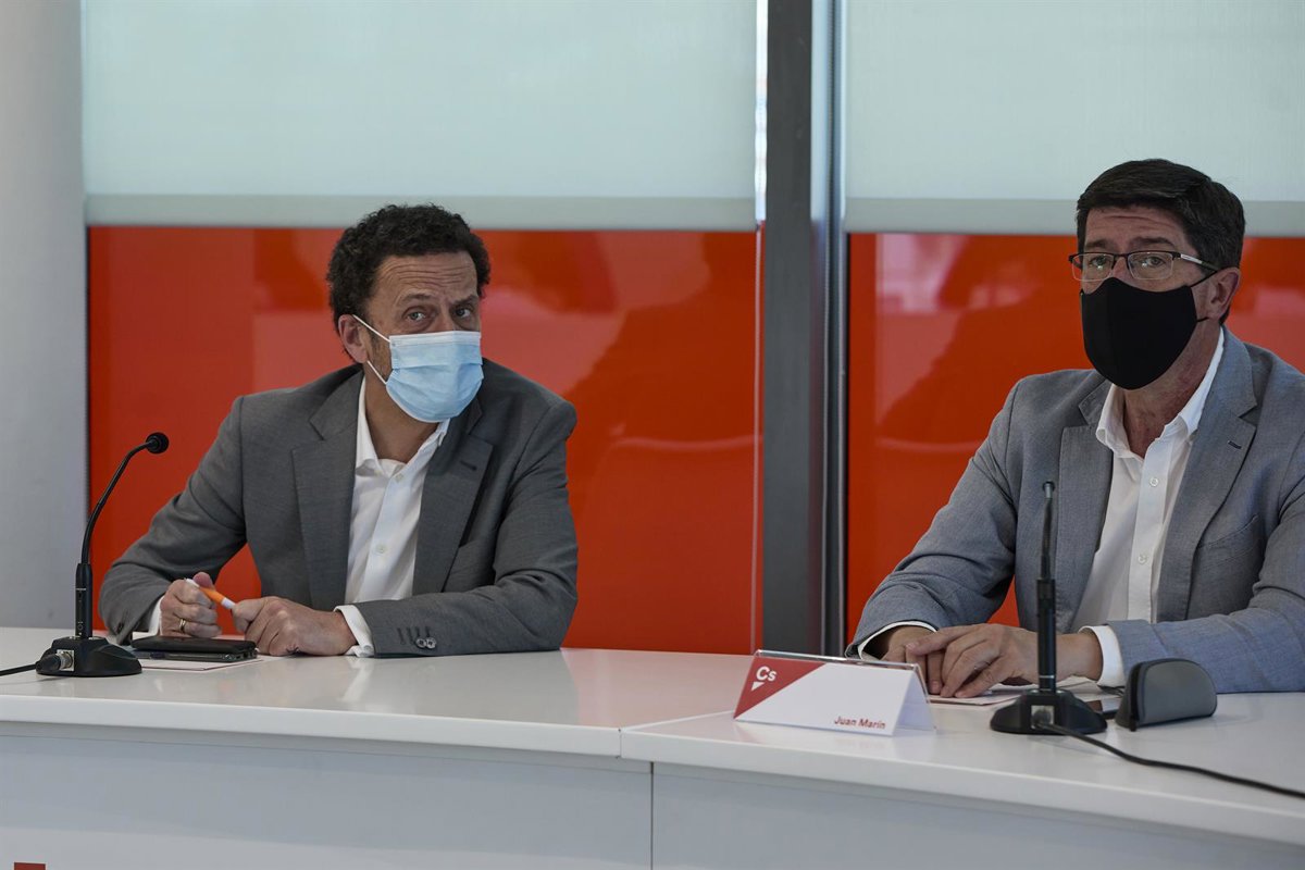 El candidato de Ciudadanos a la presidencia de la Comunidad de Madrid, Edmundo Bal (i), y el vicepresidente de la Junta de Andalucía por Ciudadanos, Juan Marín, este miércoles durante una rueda de prensa posterior a una reunión del Comité Permanente. - Jesús Hellín - Europa Press