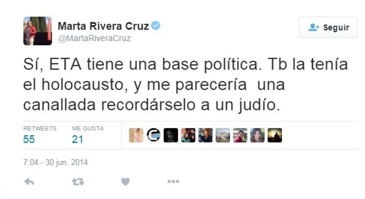 Rivera de la Cruz ha publicado en su cuenta de Twitter la historia que está detrás del polémico tuit. "Sí, ETA tiene una base política. También la tenía el holocausto, y me parecería una canallada recordárselo a un judío", afirmó en 2014 la hoy candidata.