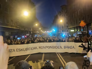 La cabecera de la marcha se ha visto además paralizada pocos segundos después de comenzar debido a que familiares de presos de ETA integrados en la asociación Etxerat han ocupado la calzada exigiendo la vuelta de sus familiares al País Vasco.