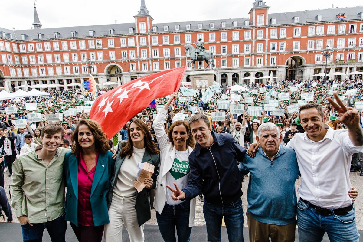 La portavoz de Más Madrid en el Ayuntamiento y candidata a la Alcaldía, Rita Maestre, la candidata a la presidencia de la Comunidad, Mónica García, el líder de Más País, ñigo Errejón durante un mitin de Más Madrid en la Plaza Mayor - Carlos Luján - Europa Press