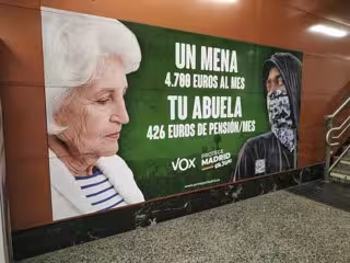 Los carteles incluyen mensajes como 'Un MENA, 4.700 euros al mes. Tu abuela, 426 euros de pensión/mes', junto al logo de Vox y su lema de campaña 'Protege Madrid'. En el mismo cartel se ve la imagen de dos personas, una mujer de avanzada edad y, en otro, un hombre encapuchado y enmascarado con tez oscura.