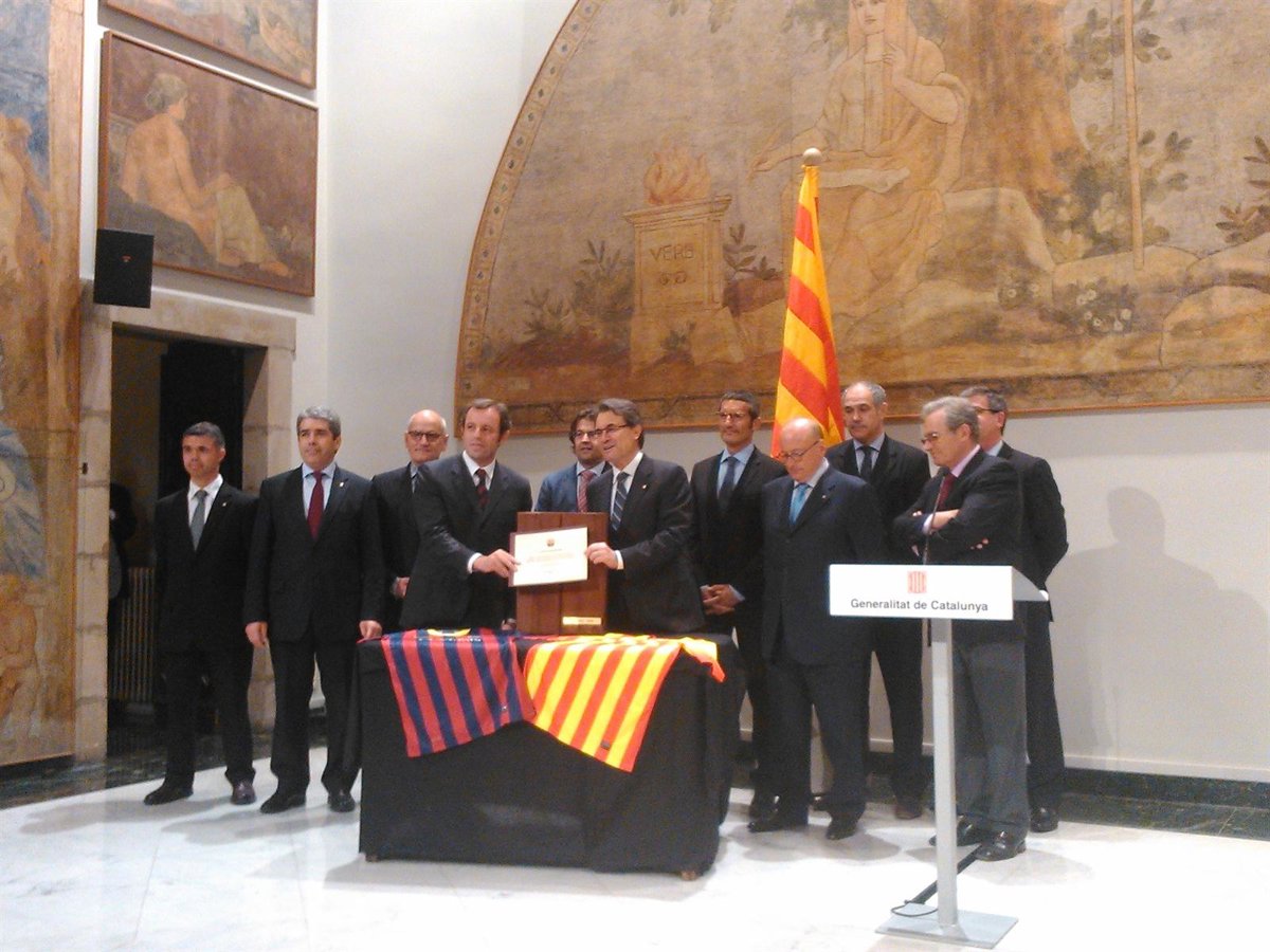 "Es un acto (llevar la 'senyera') que hacéis al servicio del país, donde se reúnen las esencias del deporte, la ciudad de Barcelona, que es la capital, y el país, que es Cataluña, con el escaparate que es el Barça de puertas adentro además de ser un gran embajador de puertas a fuera", ha asegurado tras recibir en el Palau de la Generalitat ambas camisetas, en un acto que ha contado con la presencia del conseller de Presidencia, Francesc Homs, del secretario general del deporte catalán, Ivan Tibau, así como de buena parte de la Junta Directiva blaugrana.