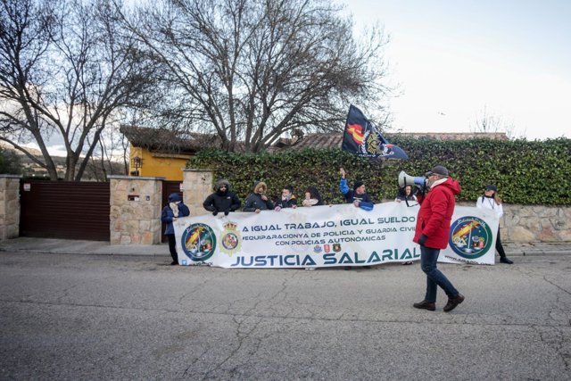En la protesta se han lanzado diferentes consignas, megáfono en mano, a favor de la igualdad salarial entre cuerpos policiales y también se ha desplegado una pancarta. Los guardias civiles que prestan servicio de seguridad en una garita junto al chalé han identificado a los manifestantes --una decisión que estos atribuyen al Ministerio del Interior-- y estos se han quejado por esta actuación policial y también porque una persona les ha grabado mientras protestaban.