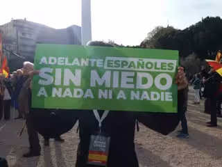 También hay un grupo de jóvenes que se identifican como militantes o simpatizantes de Vox con pancartas de color verde con lemas como "golpistas a prisión" y "adelante españoles, sin miedo a nadie ni a nada".