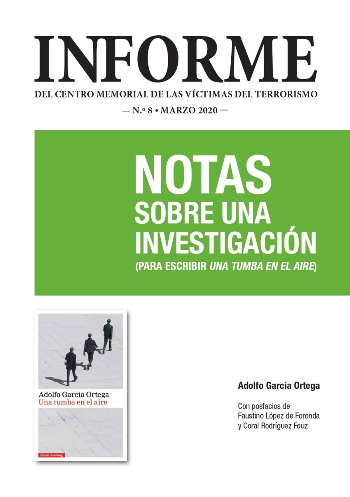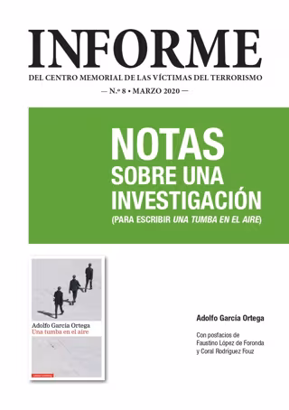 La publicación supone el octavo informe que publica el Memorial de las Víctimas del Terrorismo. En esta ocasión, recoge la investigación realizada por el escritor vallisoletano Adolfo García Ortega para documentar la obra 'Una tumba en el aire', inspirada en la desaparición de José Humberto Fouz Escobero, Jorge Juan García Carneiro y Fernando Quiroga Veiga, de la que este martes se conmemorará el 47 aniversario.