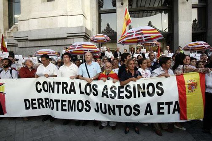 En Madrid, por ejemplo, unas 250 personas se concentraron en la plaza de Cibeles, frente al Ayuntamiento de la capital, bajo el lema 'ETA/Batasuna fuera de las instituciones', y guardaron un minuto de silencio en recuerdo de la última víctima del terrorismo etarra.