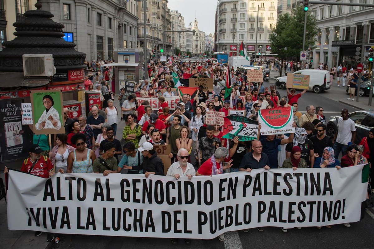 Miles de personas se han concentrado este viernes a lo largo de la Gran Vía en Madrid bajo el lema 'Alto al genocidio en Palestina, ¡viva la lucha del pueblo palestino!' para pedir su liberación y una paz duradera, a la vez que han reclamado el boicot al Gobierno de Israel liderado por Benjamín Netanyahu.
