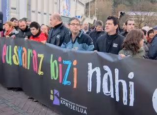 Este lema lucía en una pancarta en la cabecera de la marcha, que ha partido entre aplausos a las 17.20 horas de las proximidades del estadio de Anoeta de la capital guipuzcoana, portada, entre otros, por el secretario general de Kontseilua, Paul Bilbao.