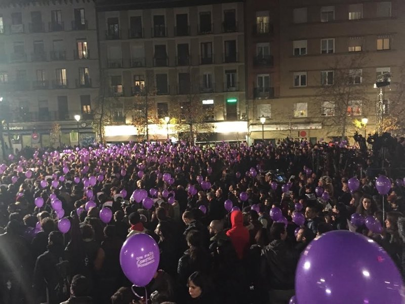 La plaza iba albergando cada vez más gente, al mismo tiempo que la música aumentaba de volumen. Así, los globos morados, las banderas de Podemos y tarjetas con un gran 'Sí' se han ido haciendo hueco en el emplazamiento, hasta convertir la plaza y sus alrededores en un campo minado de esferas moradas en apoyo a la formación liderada por Pablo Iglesias.