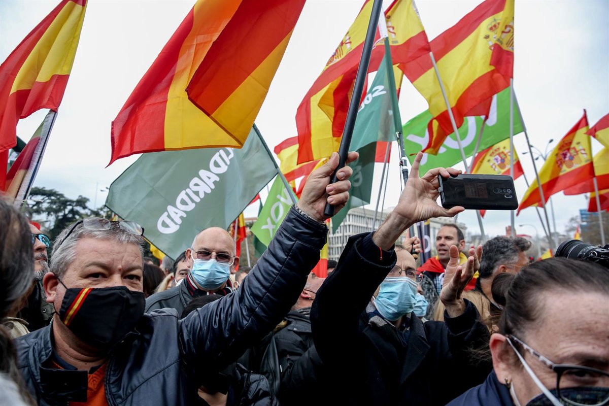 Varios manifestantes con pancartas y banderas de España y de VOX, en la protesta bajo el lema '¡Qué paguen ellos!', en Cibeles, a 19 de marzo de 2022, en Madrid (España). - Ricardo Rubio - Europa Press