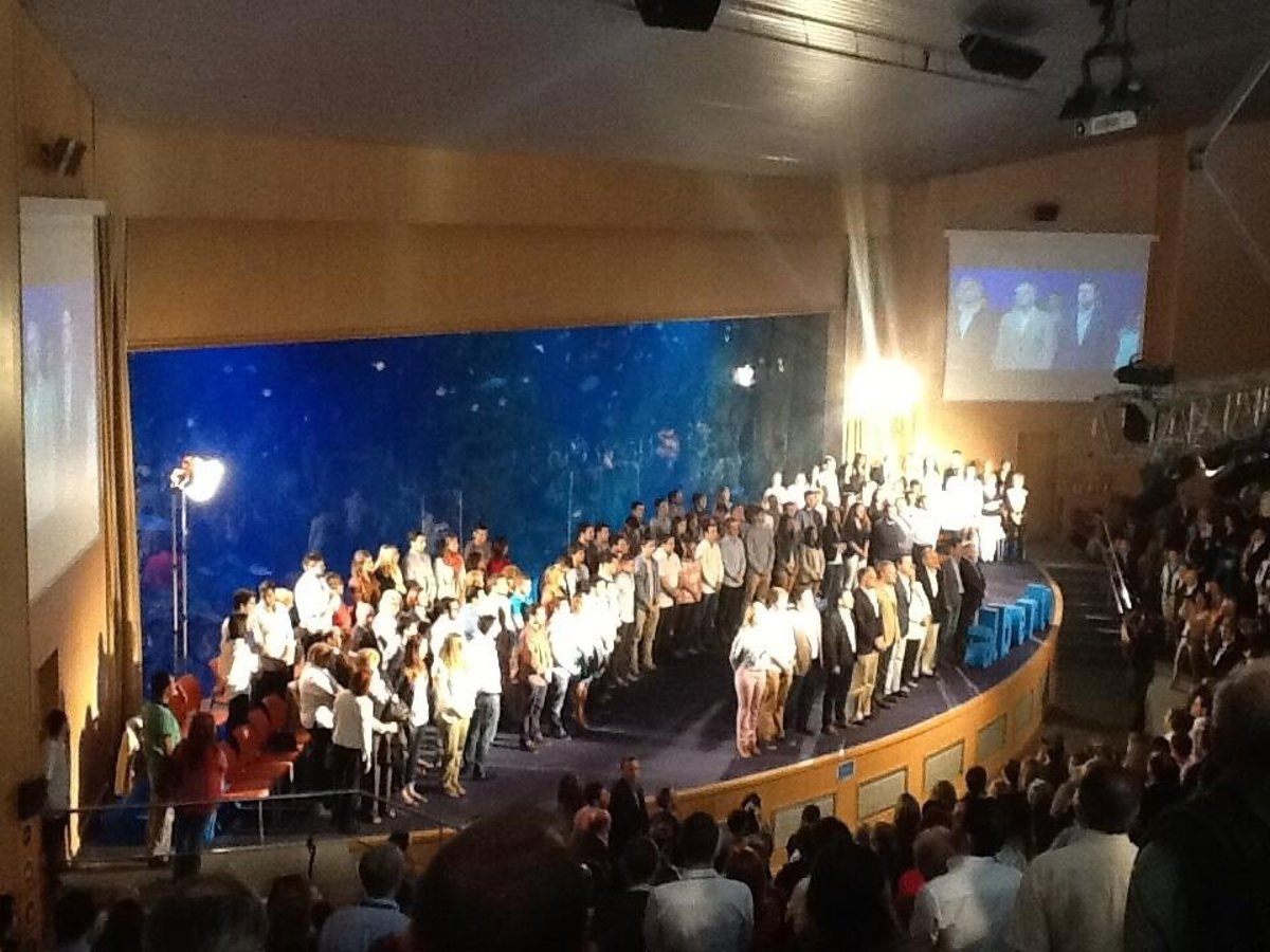 Centenares de personas --cerca de un millar, según fuentes del PP--, entre militantes, simpatizantes y representantes de la sociedad civil, han arropado al presidente de la Generalitat y del PPCV, Alberto Fabra, en el primer aniversario de su elección al frente de la formación 'popular' valenciana, en el acto organizado en el auditorio 'Mar Rojo' del Oceanográfico, en el que han participado dos ministros del Gobierno central --Luis de Guindos y José Manuel Soria-- que han tenido algunas palabras para la situación de la Comunitat, pero sobre todo, para valorar la acción del presidente Mariano Rajoy contra la crisis y para mostrar el convencimiento de que sus políticas son el camino para salir de esta coyuntura.