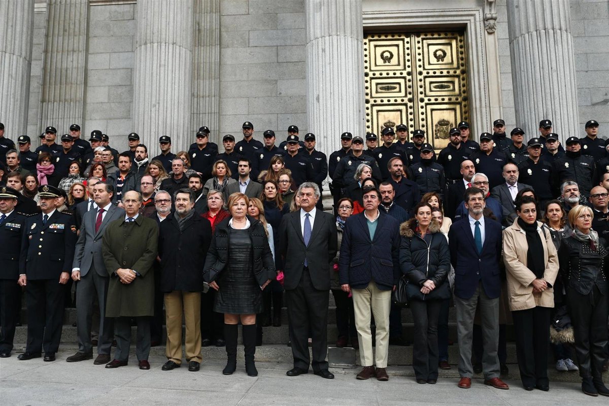 Los policías que prestan servicio en el Congreso se han sumado este lunes al minuto de silencio convocado por la institución en memoria de los dos agentes que fueron asesinados el pasado viernes como consecuencia del atentado que sufrió la embajada española en Kabul (Afganistán).