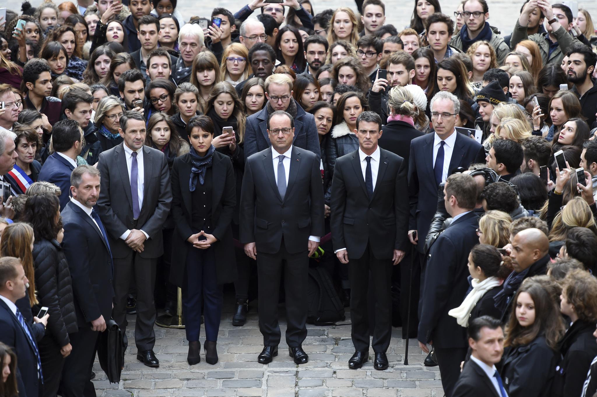 El más multitudinario ha sido el producido en la capital de Francia, donde cientos de personas han acompañado al primer ministro francés, Manuel Valls, y al presidente galo, Francçois Hollande, en un emotivo minuto de silencio a las puertas de la Universidad de la Sorbona.