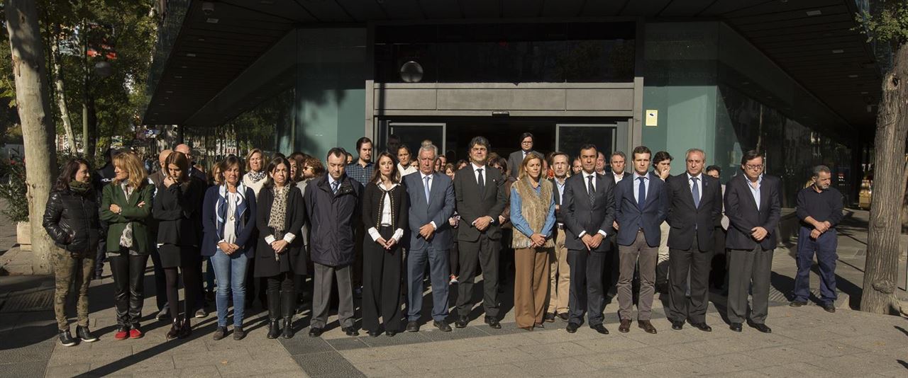 En España han sido varios los actos de silencio que han tenido lugar al medio día de este lunes: tanto en las sedes de partidos políticos como delante de los principales edificios del Estado.