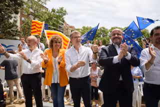 La candidata del PP a las elecciones europeas, Dolors Montserrat, el presidente del PP, Alberto Núñez Feijóo, y el presidente del PP catalán, Alejandro Fernández. - ALBERTO PAREDES - EUROPA PRESS