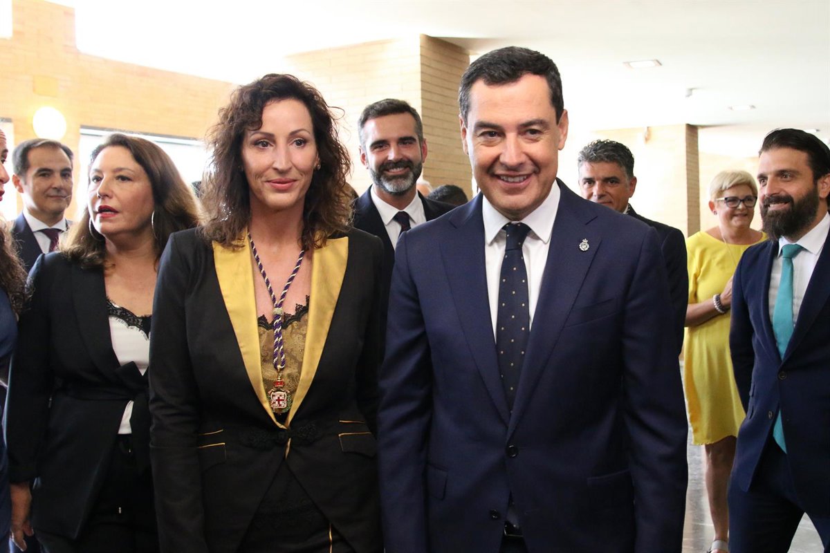 El presidente de la Junta de Andalucía, Juanma Moreno con la nueva alcaldesa de Almería, Ana Vázquez, después del pleno de investidura donde ha sido nombrada a 02 de septiembre 2022 en Almería (Andalucía, España) - Rafael González - Europa Press